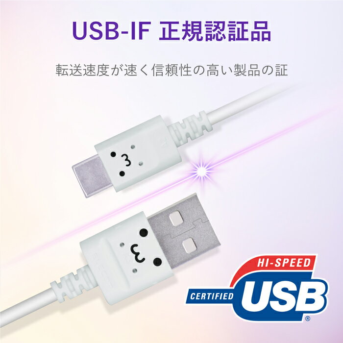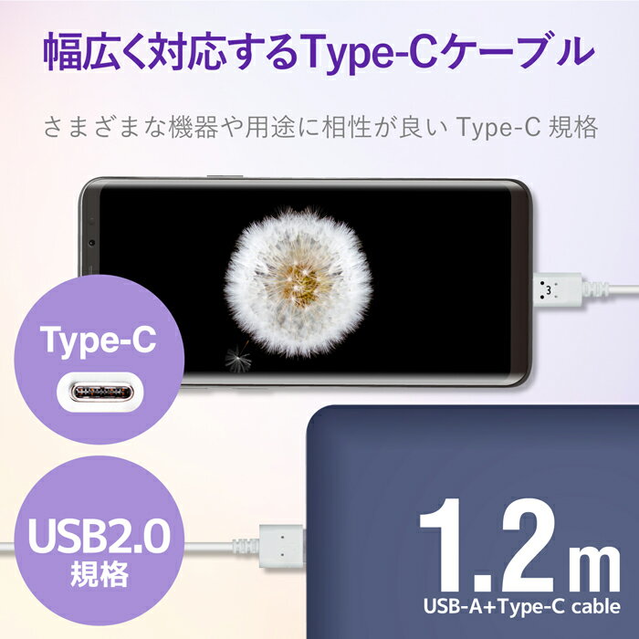 ■コネクタ形状:USB2.0Standard-Aオス-USBType-Cオス■対応機種:USBStandard-A端子搭載のパソコン・充電器・モバイルバッテリーおよび、USBType-C端子搭載のスマートフォン・タブレットなど■ケーブル長:1.2m※コネクタ含まず■ケーブル太さ:2.8mm■規格:USB2.0規格正規認証品■対応転送速度:最大480Mbps※理論値■プラグメッキ仕様:金メッキピン■シールド方法:2重シールド■ツイストペアケーブル(通信線):○■カラー:ホワイト(フェイス)■パッケージ形態:PET箱+紙台紙細くてとりまわしの良い極細ケーブルタイプ。