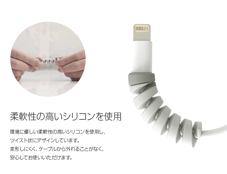 ●ツイストしながら付けるので付け外し簡単 ケーブルにツイストしながら巻き付けるので、付け外しが簡単です。