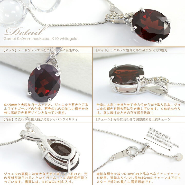 1月誕生石 ガーネット 6×9mm オーバルカット ネックレス Detailサイズトップ:約縦16mm×横7.5mm×厚み6.5mm地金K10ホワイトゴールド(K10WG)※ニッケルは含まれていないので、金属アレルギーが出にくい安心仕様です。