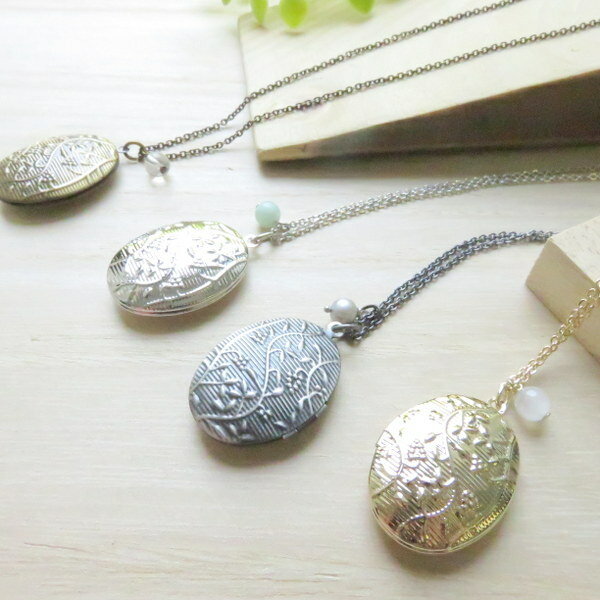 当店オリジナルの、アクセサリー単品としても上質のデザインを目指したシリーズ!アンティークな雰囲気で人気のロマンティックなロケットペンダント!48通りのセミオーダーで、厳選天然石とメタルカラー、長さが選べるこちらは、植物の優しいライン、ボタニカル柄がおしゃれで、アンティークなタイプ。